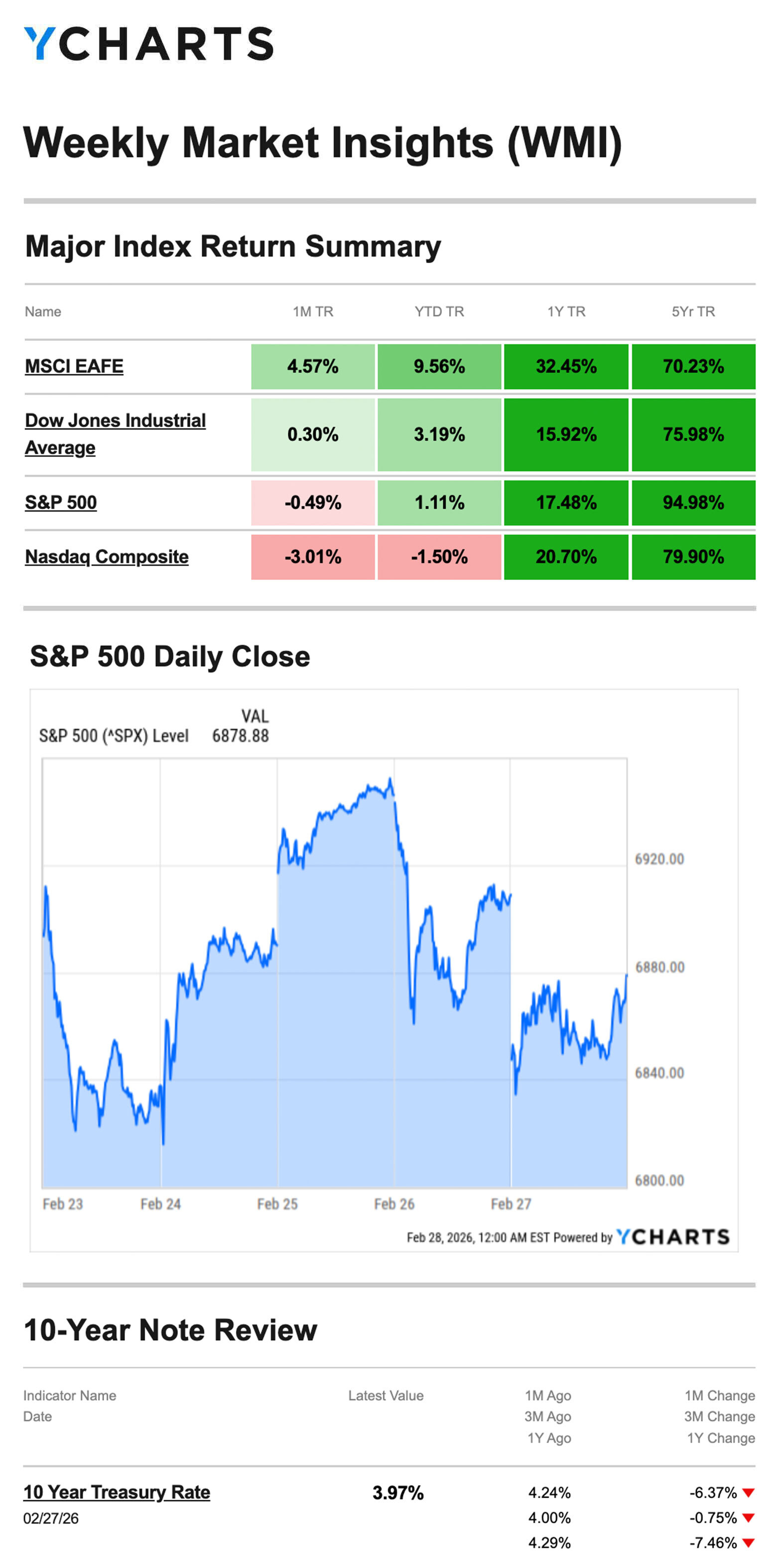 Source: YCharts.com, February 28, 2026. Weekly performance is measured from Monday, February 23, to Friday, February 27. TR = total return for the index, which includes any dividends as well as any other cash distributions during the period. Treasury note yield is expressed in basis points.